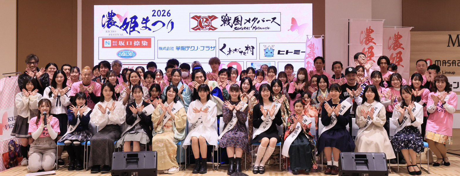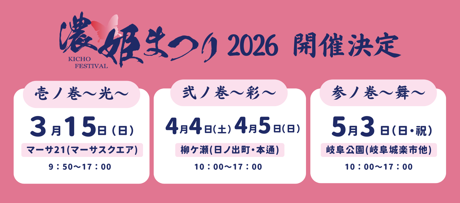 | 開催日・場所 | 3月15日(日) @マーサ21 マーサスクエア 濃姫グランプリ公開オーディション、ステージ、ブース 4月4日(土)・5日(日) @柳ケ瀬商店街(日ノ出町、柳ケ瀬本通) ステージ、ブース、謎解き、大抽選会 他 5月3日(日) @岐阜公園(岐阜城楽市他) 詳細 coming soon… |