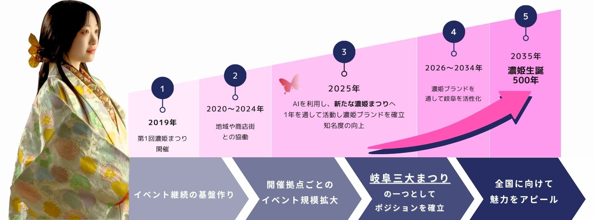2035年は、濃姫生誕500年を迎える特別な年です。この記念すべき年に向け、濃姫まつりは岐阜三大まつりの一つとして確固たる地位を築き、地域の活性化を目指してさらに発展していきます。多くの方々に楽しんでいただけるよう、柳ケ瀬エリア、岐阜城エリア、鷺山エリアの3つの拠点を中心にイベントを展開し、回遊性を高める工夫を行います。